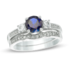Simply stunning, this glistening bridal set is a beautiful beginning to the rest of your lives together. Shimmering in cool 10K white gold, the engagement ring features a dazzling 6.0mm  bright blue sapphire flanked by a pair of smaller created white sapphires. Sparkling pav??-set diamonds adorn each side of the tapered shank for a look she can’t help but admire. On your special day, a coordinating contoured diamond-lined wedding band completes this significant expression of your love. Radiant with 1/8 ct. t.w. of diamonds and a brilliant buffed luster, this bridal set is everything she imagined and more.