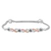 This fabulous bolo bracelet for her captures the eternal love for a pet with paw prints and infinity signs. Black diamonds accent the paw prints, and curves of 10K rose gold embellish the infinity signs for splashes of color. The sterling silver bracelet has a total diamond weight of 1/10 carat. The  clasps slide along the wheat chain to adjust the bracelet up to 9.5 inches in length. Black diamonds are treated to permanently create the intense black color.